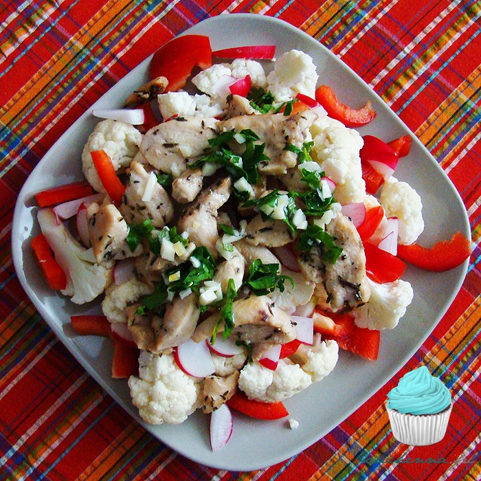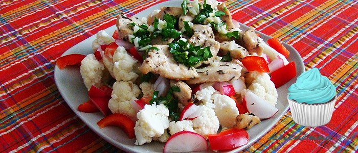 Wprowadzamy na blogu nową kategorię – dietetyczne. Będą ją zasilać przepisy na dania lekkie, mniej kaloryczne, pomocne w tworzeniu jadłospisu dla osób dbających o zdrowie i szczupłą sylwetkę. Na początek surowy kalafior. To smaczne warzywo stosowane jest w tej formie dość rzadko, a może być podstawą dla wielu chrupiących i kolorowych sałatek. Tym razem występuje w towarzystwie kurczaka i sosu czosnkowo – ziołowego. Polecam 😀